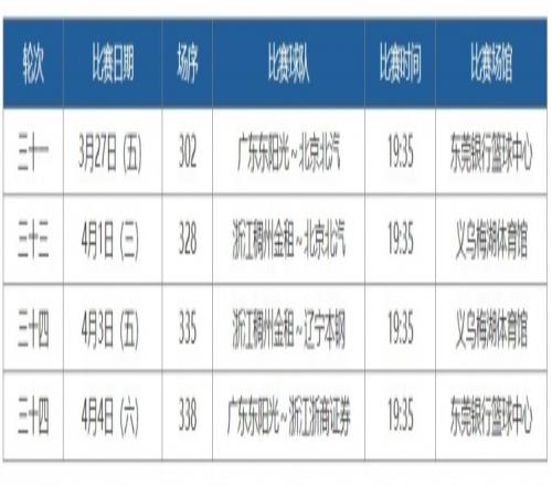 体育播报3月24日宣 CBA官网公布了常规赛第31轮到第35轮高价值场次评定结果,有4场比赛入选,分别是广东VS北京、浙江VS北京、浙江VS辽宁以及广东VS广厦。