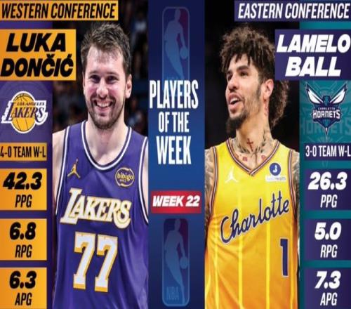 NBA官方公布了第22周的东西部周最佳球员,东部由黄蜂后卫鲍尔当选,西部由湖人后卫东契奇当选。鲍尔上周场均贡献26.3分+6.8篮板+6.3助攻+2.3抢断,带领黄蜂队取得3胜0负的战绩。据统计,这是鲍尔生涯首次拿到该奖项。东契奇上周场均爆砍42.3分+6.8篮板+6.3助攻+3抢断,带领湖人队取得4胜0负的战绩。据统计,这是东契奇连续两周获此殊荣,也是东契奇本赛季第4次拿到该奖项,生涯第19次拿到该奖项。沃克、布朗、杜伦、哈登、莫布里、唐斯、阿夫迪亚、克林根、道苏姆、戈贝尔、亚历山大、阿门、文班亚马等人获得了周最佳提名。
