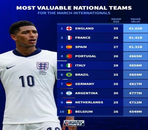 北京时间3月24日,德转列出了3月国际比赛国家队身价榜,英格兰代表队以35人16.2亿欧元的总身价排名第一,法国14.1亿欧元第二,西班牙13.1亿欧元第三。